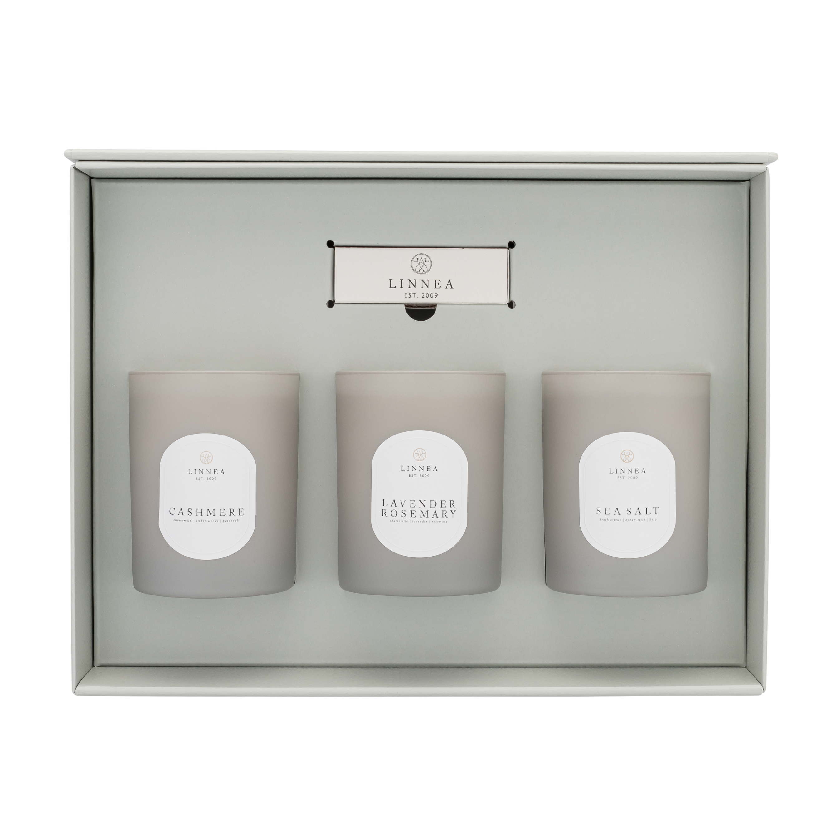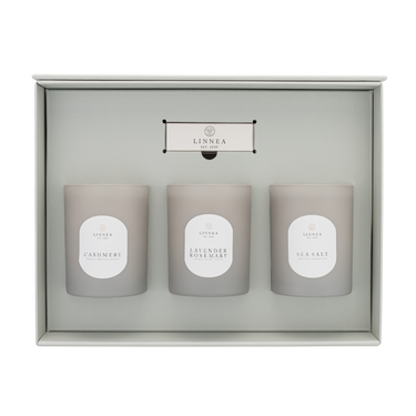 The Bestseller Giftset features three beloved Large Candles Lavender Rosemary, Cashmere, and Sea Salt. Each scent sets its own mood, creating a timeless trio that feels inviting and effortless. Presented in our signature grey textured paper box with embossed detailing, the unwrapping reveals candles nestled in crisp tissue with a custom seal for a refined ritual. Designed for LINNEA Layering, this set lets you blend herbal calm, soft warmth, and clean coastal clarity to create a perfectly balanced fragrance story. Ideal for gifting or elevating your everyday moments.