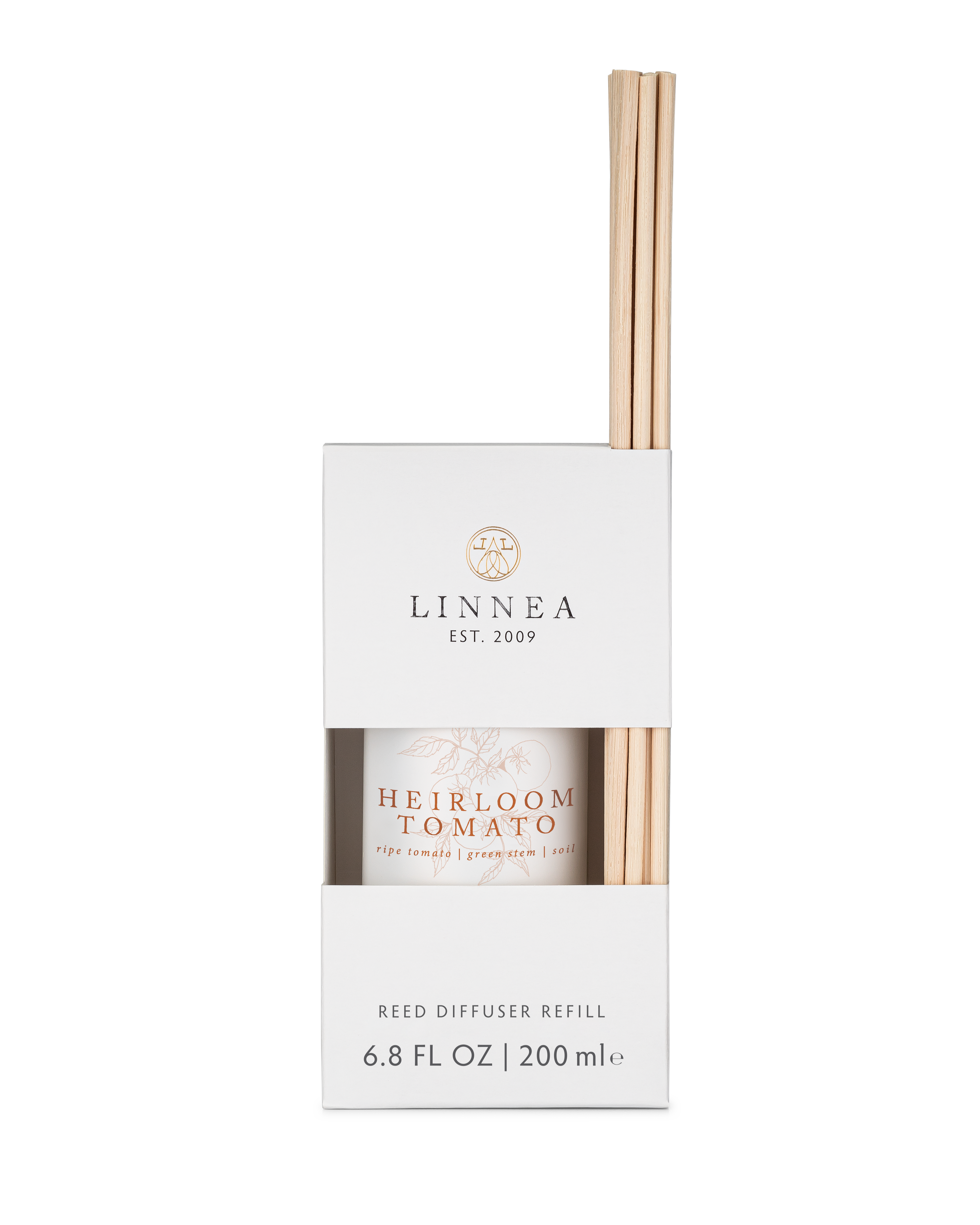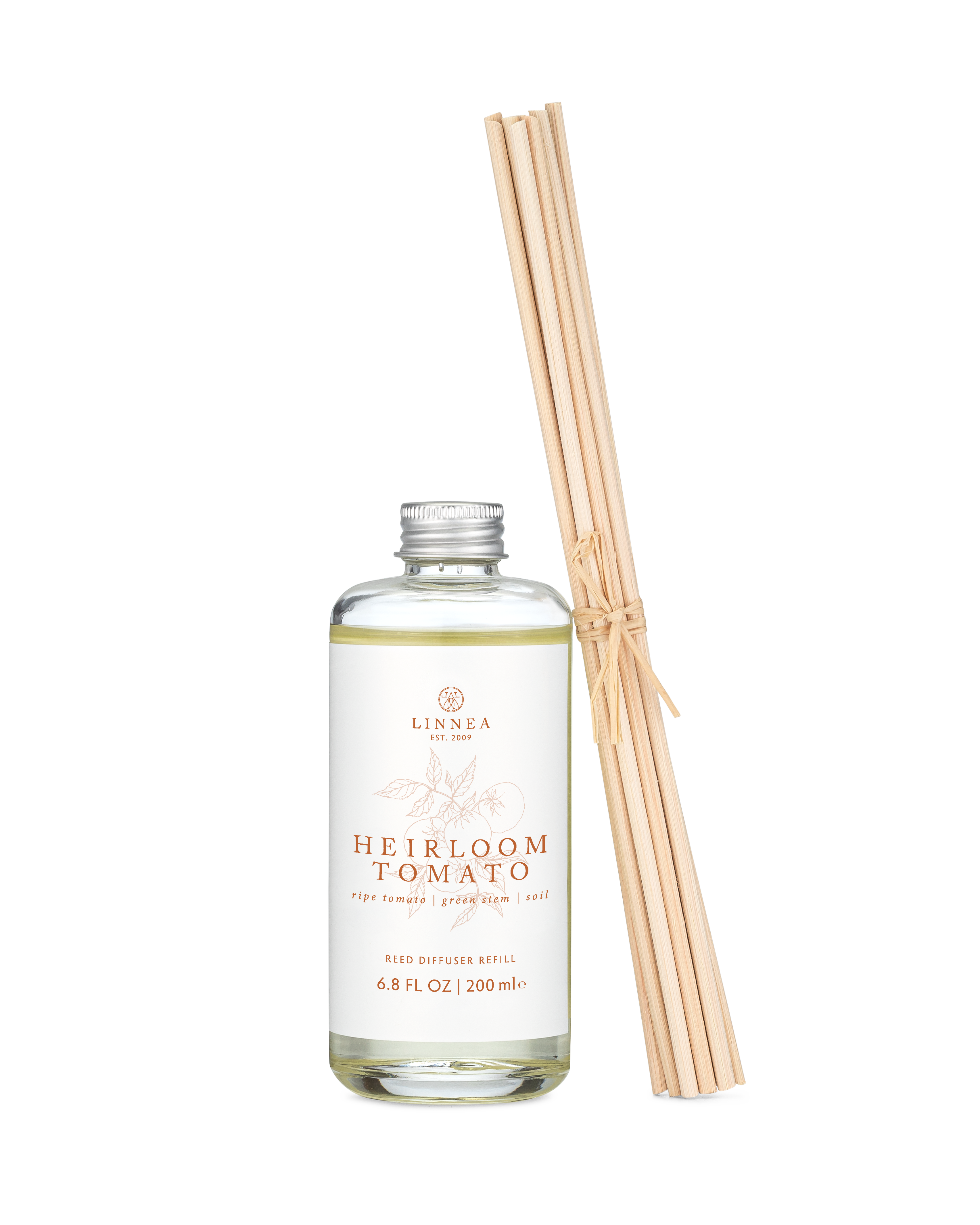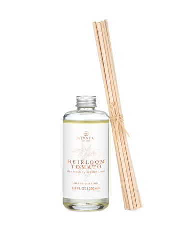 New to LINNEA! Elevate your space with the Heirloom Tomato Reed Diffuser Refill Set, a fresh and earthy scent profile with ripe tomato, green stems, and soil, evoking the essence of summer gardens and the tradition of homegrown harvests. This refill set ensures long-lasting fragrance while maintaining a sophisticated, airy ambiance. Refilling the hand-blown glass vessel is effortless. Simply pour the fragrance oil into a clean, dry vessel, insert the 10 natural rattan reeds, and allow them to absorb the scent. Flip the reeds regularly to refresh the aroma and rinse the vessel with warm, soapy water before refilling for best results.
